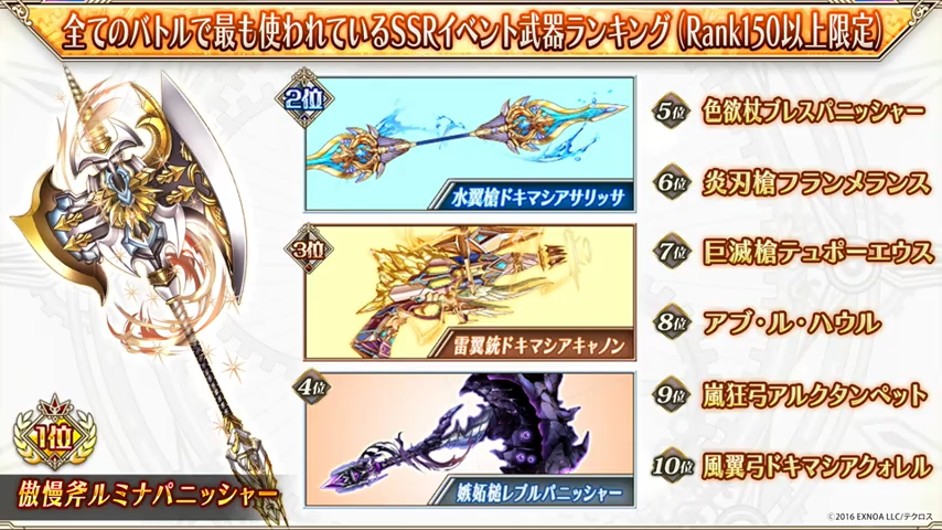 肝心の新機獣武器は後述するフェス武器(眼武器?)と同じ効果で、どちらかというと気になるのは英霊武器の終凸Ⅱ実装。これは全部やろうと思ったらかなり大変な気がします。終凸Ⅱにすると英霊固有のスキルが追加されて、ティアラ以上の連撃アップがついたりゲージ上昇量UPなどがつくようです。英霊バーストの足並みが遅れる事態を緩和する措置という雰囲気が見て取れましたが、そんなに困ることかな。まあ競技会では結構苦しめられてるんで、いいでしょう。
