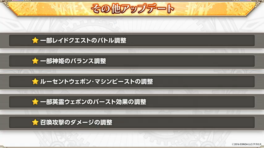 各種バランス調整は後日お知らせということで。ルーセントに期待。MBも強化されるようですが、ステータス強化と召喚効果でお茶を濁されそうな気がする。