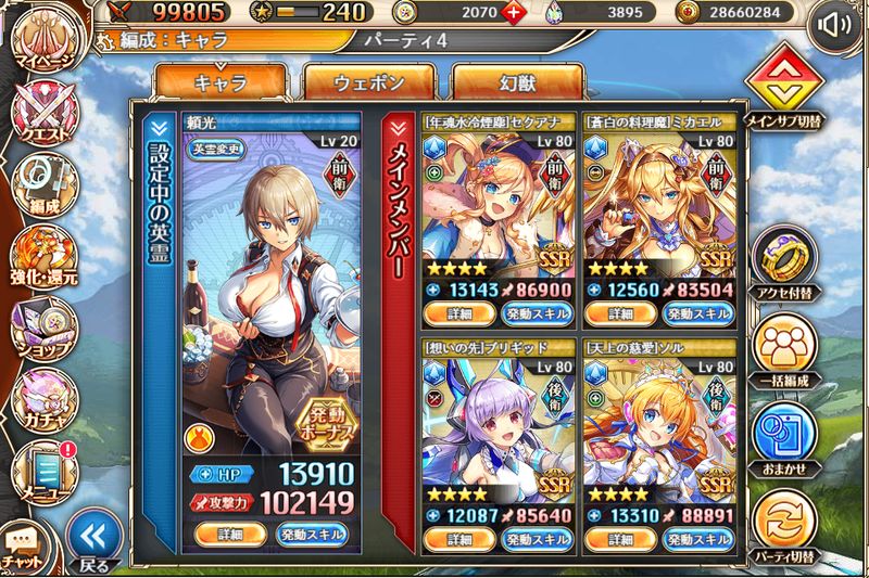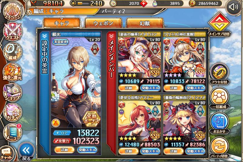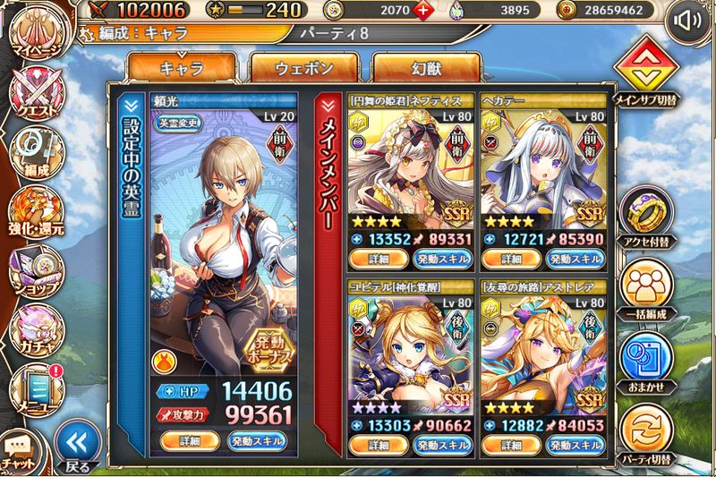 冗談抜きで一年くらい編成変わってない気がする。金鵄込みで5連フルバまで可能ですがターンあたりのダメージは普通。最近は通常軸も強力ですが光といえばバーストみたいなところはあるんで、一番3連フルバを実現しやすい属性だと思います。逆にバーストで火力を出せる神姫は全然いないんで、ターンあたりのダメージは伸び悩みやすいのかもしれない。