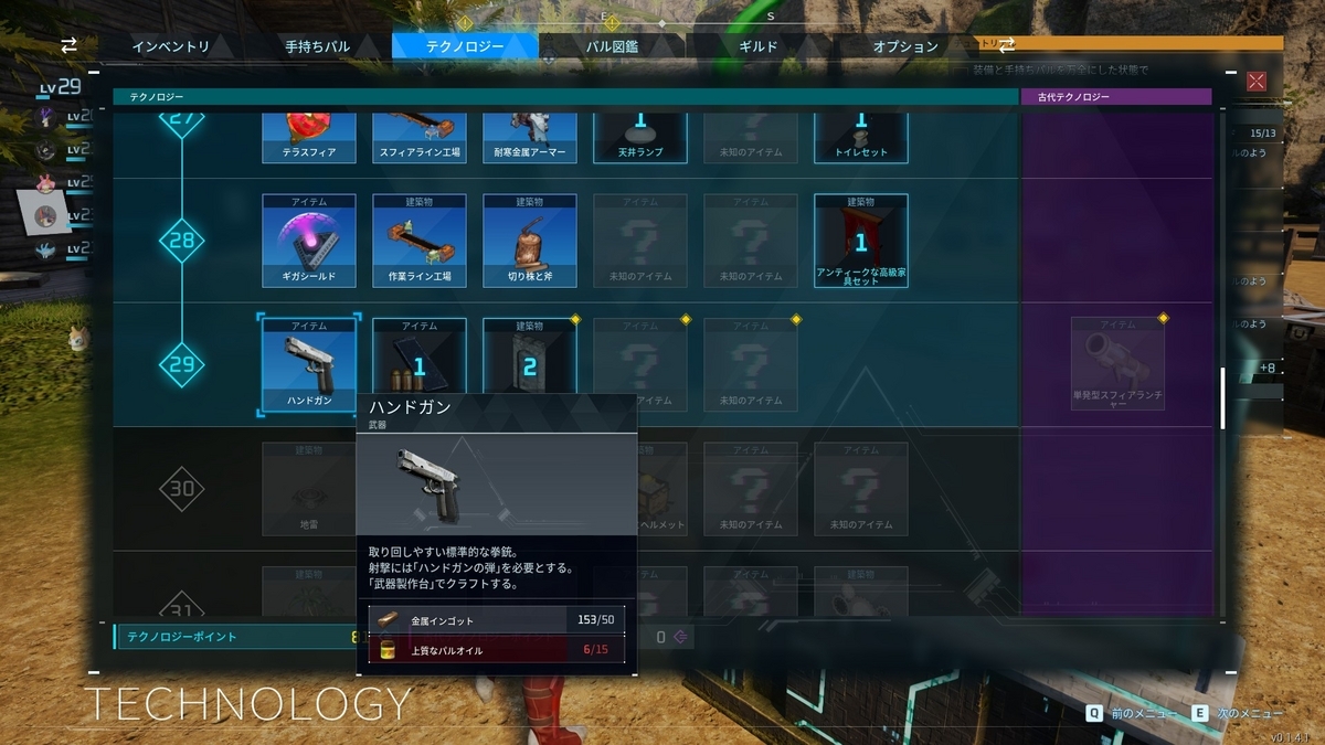 35→44にどのくらい時間がかかるか想像つかないんで、普通に未達になる可能性がある。とりあえずパルとタマゴの乱獲を進めます。ポンプ式ショットガンの42、ダブルバレルショットガンの39くらいまではちゃんと上げます。