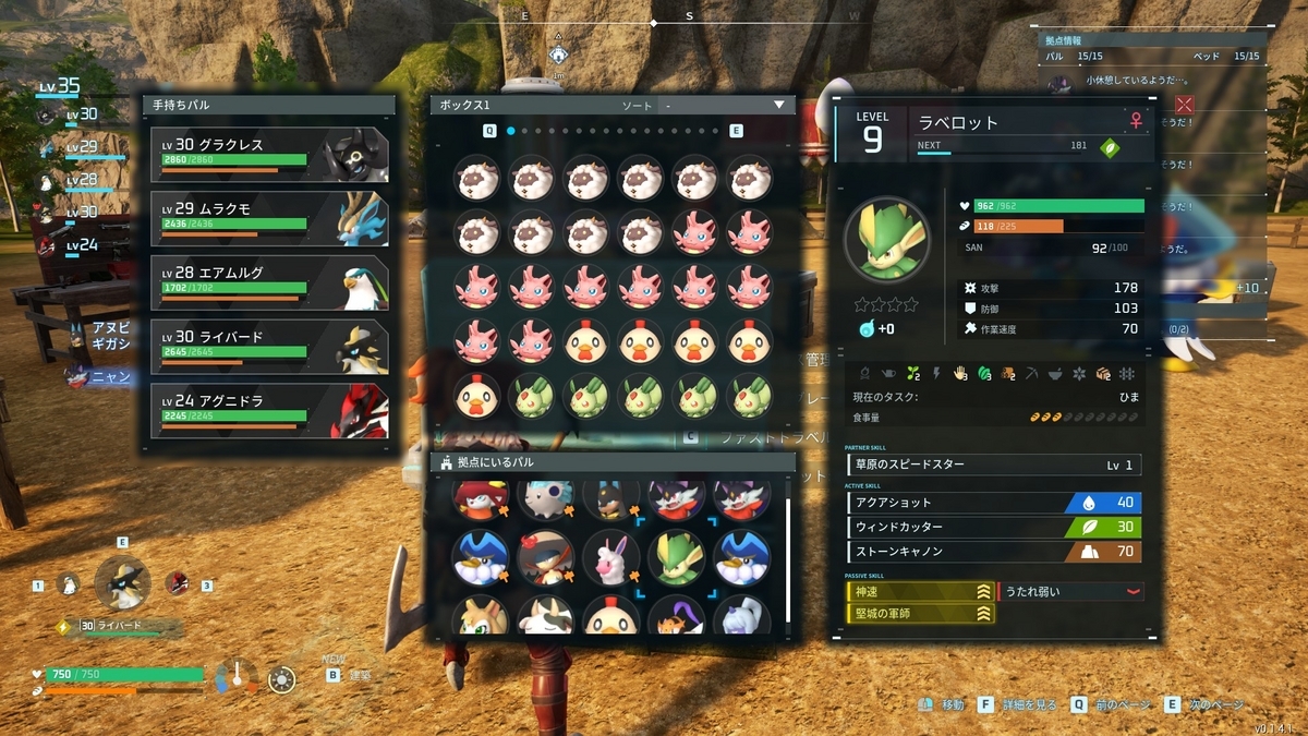 そして孵化待ちの間に最終移動用パルを全確保。ライバードはサドル解放が34なのでレベリングが必要ですが、37のイグニクスよりも先なのは嬉しい。ボスで確保できるのもハナマル。エアムルグは適当に捕まえて、ムラクモはキャプペン×モコロンで配合。ムラクモは走るのが好きもついていて最高でした。
