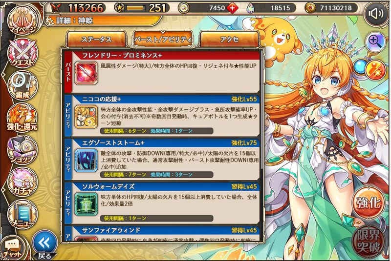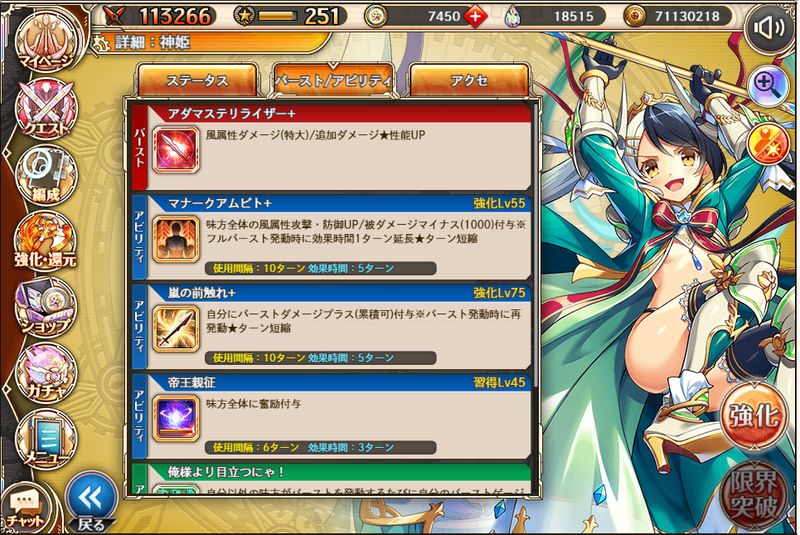 本家キャラでちゃんと強い貴重な火属性神姫です。火属性はコラボにキーマンが多い関係もあって、評価はかなり高いです。というか火の恒常が弱すぎるのでアマテラスがいないと話にならない。